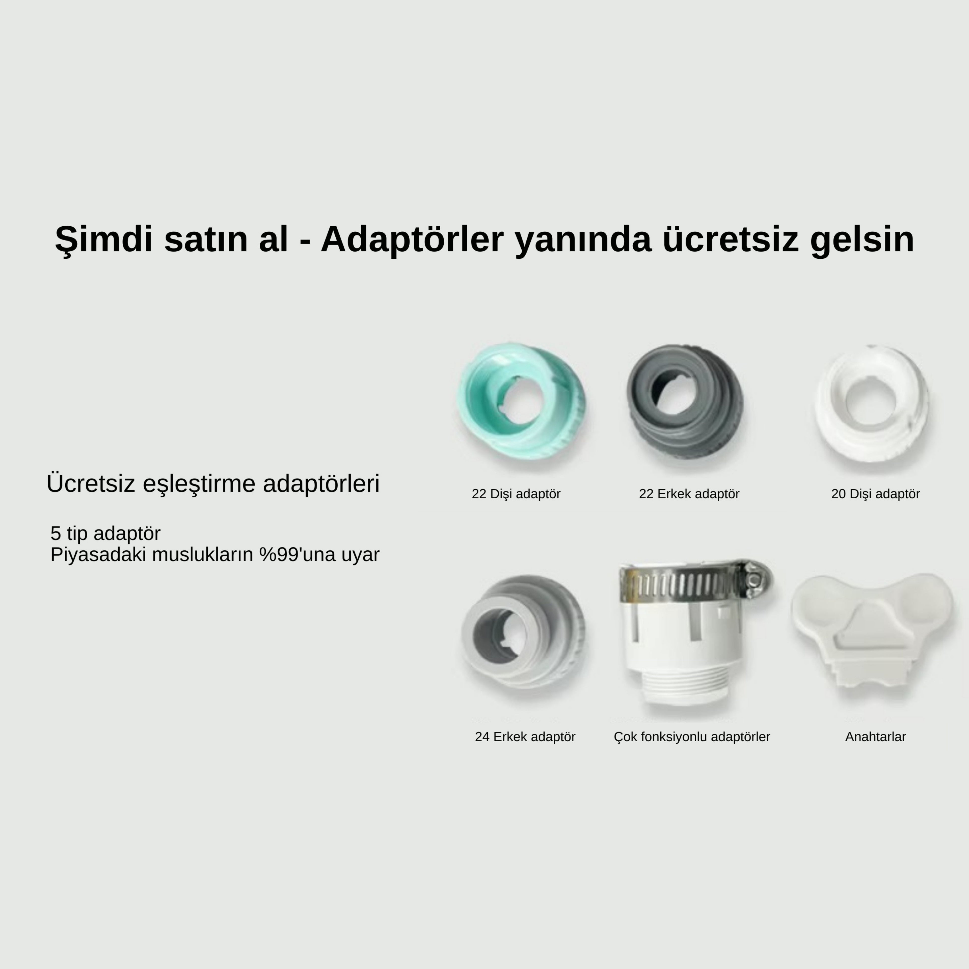 WinZaa™, yuvarlak uçlu perlatörlü muslukların %98'ine uygundur. Gerekli tüm alet ve adaptörler dahildir. Sağlanan adaptörler musluğunuza uymuyorsa, musluğunuzun bir fotoğrafıyla bize ulaşın; ücretsiz olarak ek adaptörler gönderelim.